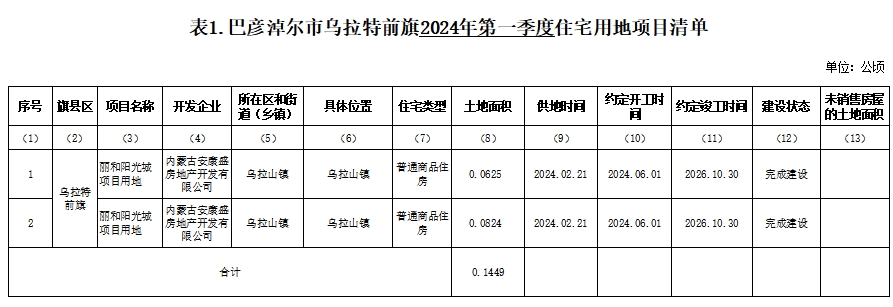 巴彦淖尔市乌拉特前旗2024年第一季度住宅用地项目信息
