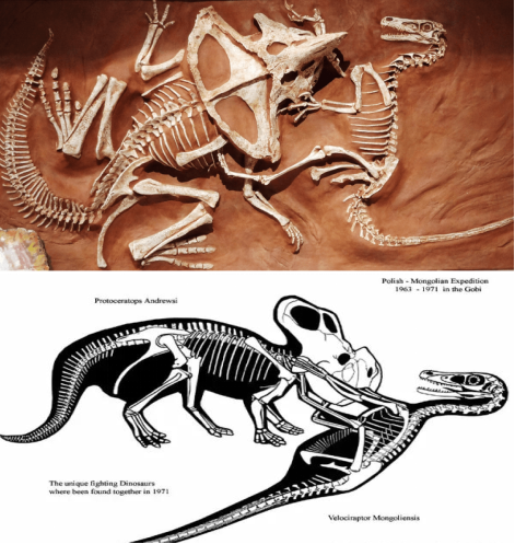 1971年,古生物学家在蒙古国境内的联合考察中发现了一组化石,名叫“搏斗中的恐龙”(编号GIN 100/25)。其中有一只是原角龙,另外一只是我们今天要讲的主角伶盗龙。在这块化石里,两只恐龙扭打在一起。伶盗龙的武器是它后肢上的巨大脚趾,狠狠插入了原角龙的喉咙。而原角龙的武器则是它们非常有力的嘴,紧紧地咬住了伶盗龙的前肢,让它无法脱身。然而这场战争最终也没有赢家,突如其来的沙尘暴将它们双双掩埋。于是,这样一个进攻与防守的瞬间就被定格了下来。