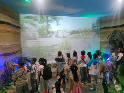 同学们进入光影隧道,观看3D电影《走进中生代》,身临其境地体验穿越神秘中生代的感觉。
