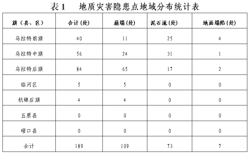 灾害隐患点总数的2.65%;杭锦后旗地质灾害隐患点4处,占全市地质灾害隐患点总数的2.12%(见表1),五原县、磴口县无地质灾害隐患点。威胁对象主要为居民、公路、农田、房屋、田地、牲畜、矿区等。