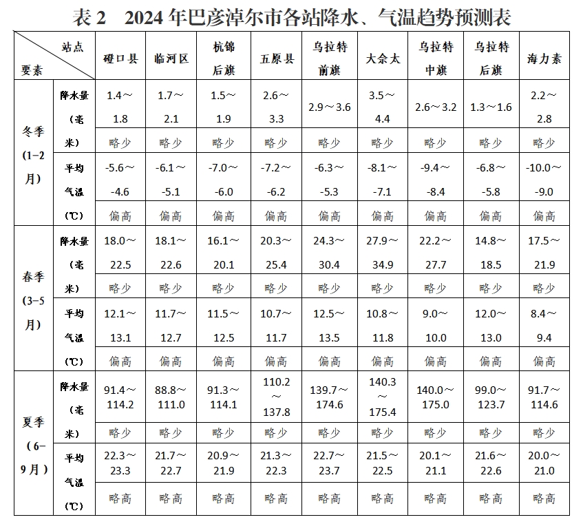 根据巴彦淖尔市气象局《巴彦淖尔市2024年气候趋势展望》,预计2024年汛期巴彦淖尔市气候复杂多变气温较常年高0~1℃,降水较常年少0~2成,极端性强,旱涝并重。需注意防范短时强降水可能引发的山洪、农田渍涝等次生灾害,采取措施降低强对流天气对农牧业产生的影响;北部发生阶段性干旱的可能性较大,需做好抗旱准备。详见表2。