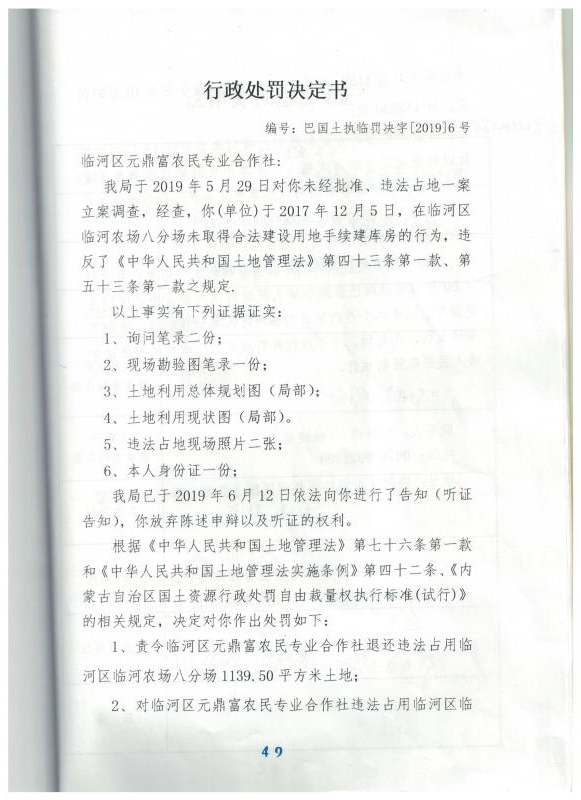 行政处罚决定书:巴国土执临罚决字【2019】6号