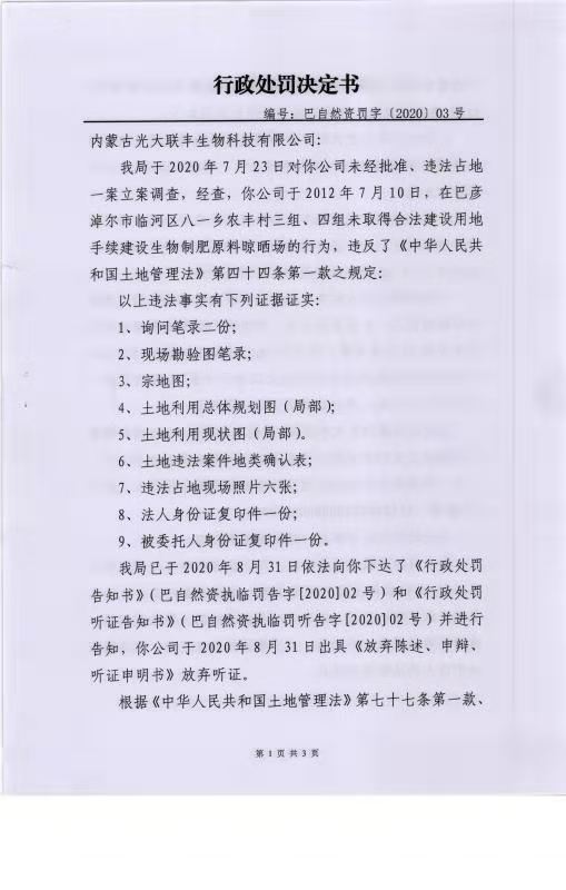 自然资源行政处罚决定书 巴自然资罚字[2020]第003号