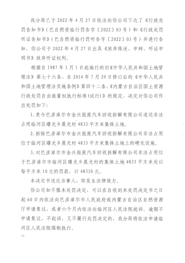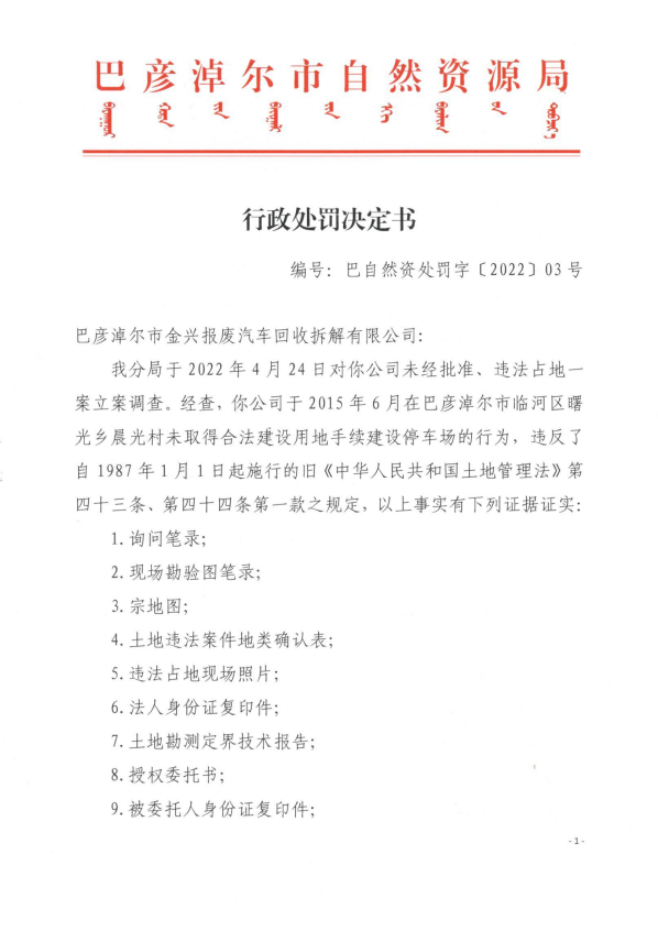 自然资源行政处罚决定书 编号:巴自然资处罚字〔2022〕03号