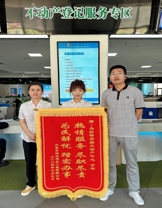 这一充满温情且极具人性化的举措,触动了借款人的内心,被工作人员的真诚与担当深深打动,最终决定送上这面锦旗,深切表达对乌拉特后旗不动产登记中心工作人员的感激与赞誉。